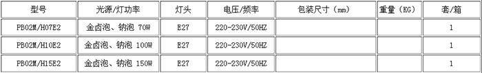 注:該系列標(biāo)準(zhǔn)配置:150W金屬鹵化物燈。也可根據(jù)需要配用光源;70W,100W金鹵燈或70W,100W高壓鈉燈。