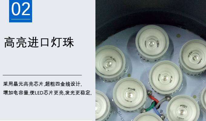 2、采用晶元高亮芯片,超粗四金線設(shè)計,增加電容量,使LED芯片更亮,發(fā)光更穩(wěn)定,
