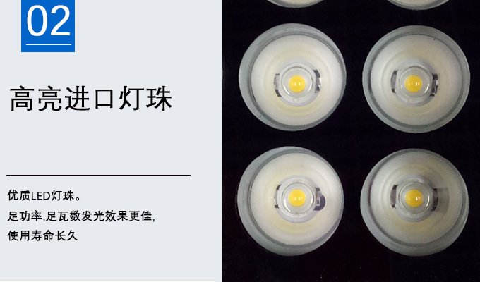 1、優(yōu)質(zhì)LED燈珠。足功率,足瓦數(shù)發(fā)光效果更佳,使用壽命長久