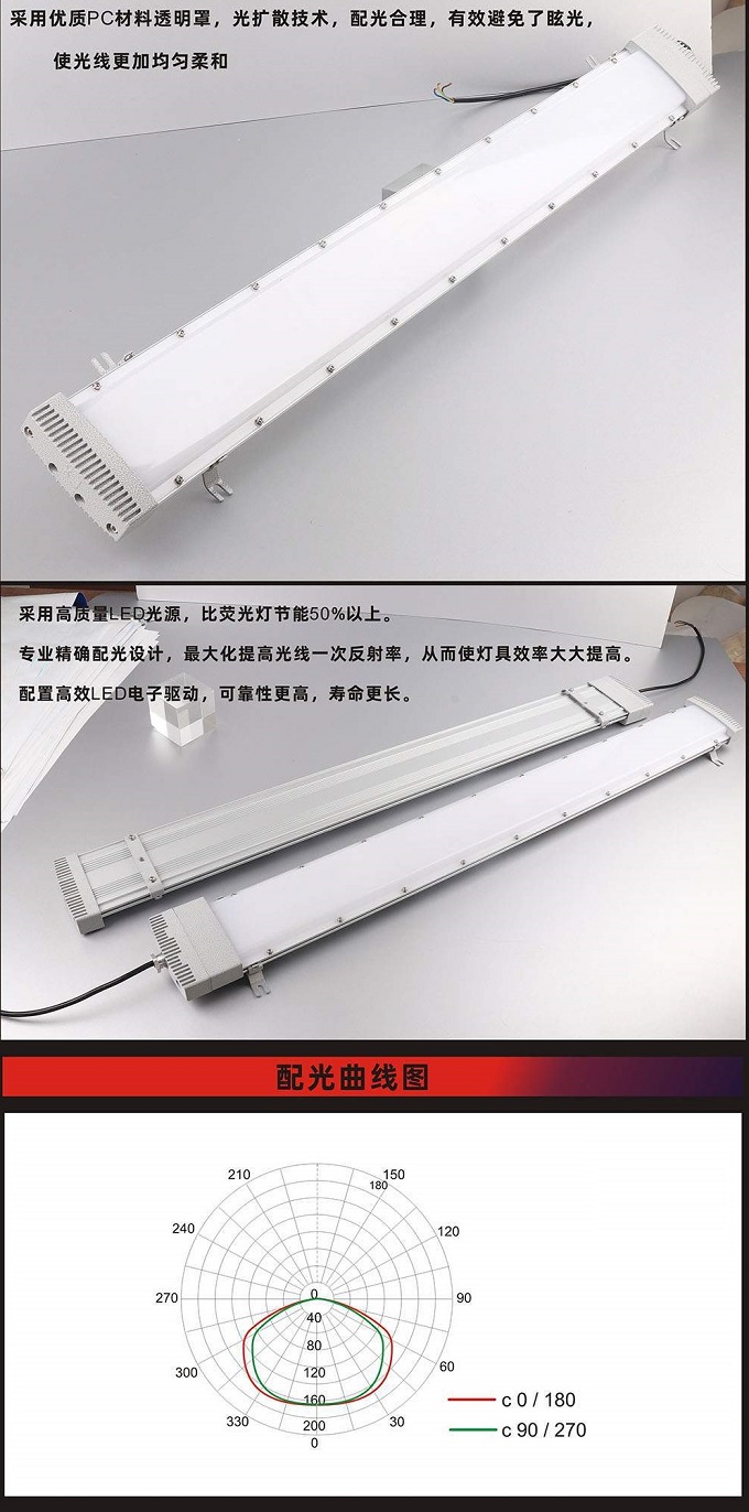 - 產品簡介:產品特點:? ●高純鋁型材殼體,表面氧化處理,導熱性能好; ●優(yōu)質PC材料透明罩,光擴散技術,配光合理,有效避免眩光,使光線更加均勻柔和; ●配置LED條形光源,單向發(fā)光,光線均勻柔和,光效>100Lm/W,Ra>80;壽命長,綠色環(huán)保; ●特殊結構設計,使用LED光源工作產生的熱量及時有效散發(fā),保證光源性能; ●特制的恒流恒壓源,寬電壓輸入,恒功率輸出,具有分流、恒流、開路、 短路等保護功能; ●高功率因數(shù),COSΦ>0.95; ●安裝方式多種,另可根據(jù)用戶要求定制。 技術參數(shù): 額定